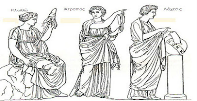 Την κυκλική κίνηση των σφοντύλων παρακολουθούσαν καθισμένες πάνω σε θρόνους οι τρεις Μοίρες, η Λάχεσις, η Κλωθώ και η Άτροπος, φορούσαν λευκά φορέματα, είχαν στέμματα στο κεφάλι και συνόδευαν με το άσμα τους την αρμονία των Σειρήνων. Η Λάχεσις τραγουδούσε τα παρελθόντα, η Κλωθώ τα παρόντα και η Άτροπος τα μέλλοντα.