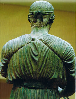 Η μία είναι η ακαμψία του, που δείχνει το σώμα από τη μέση και κάτω ίσιο και ατάραχο, με τις πτυχές τού μακρύτατου χιτώνα βαριές και ατρικύμιστες. Η δεύτερη κίνηση είναι το γέρμα τού κορμιού προς τα δεξιά και ακόμα εντονότερα της κεφαλής, η οποία γέρνει κι αυτή προς το ίδιο μέρος. Η κεφαλή είναι βυθισμένη, σ' έλαφρό όνειρο ευτυχίας. Ακούει τη μουσική τού πλήθους. Βλέπει το μεγάλο παλμό του και τη γραφική ανωμαλία του. Το στόμα του μισανοιγμένο. Τα χείλη μικρά και σαρκωμένα. Στόμα λουλουδένιο.